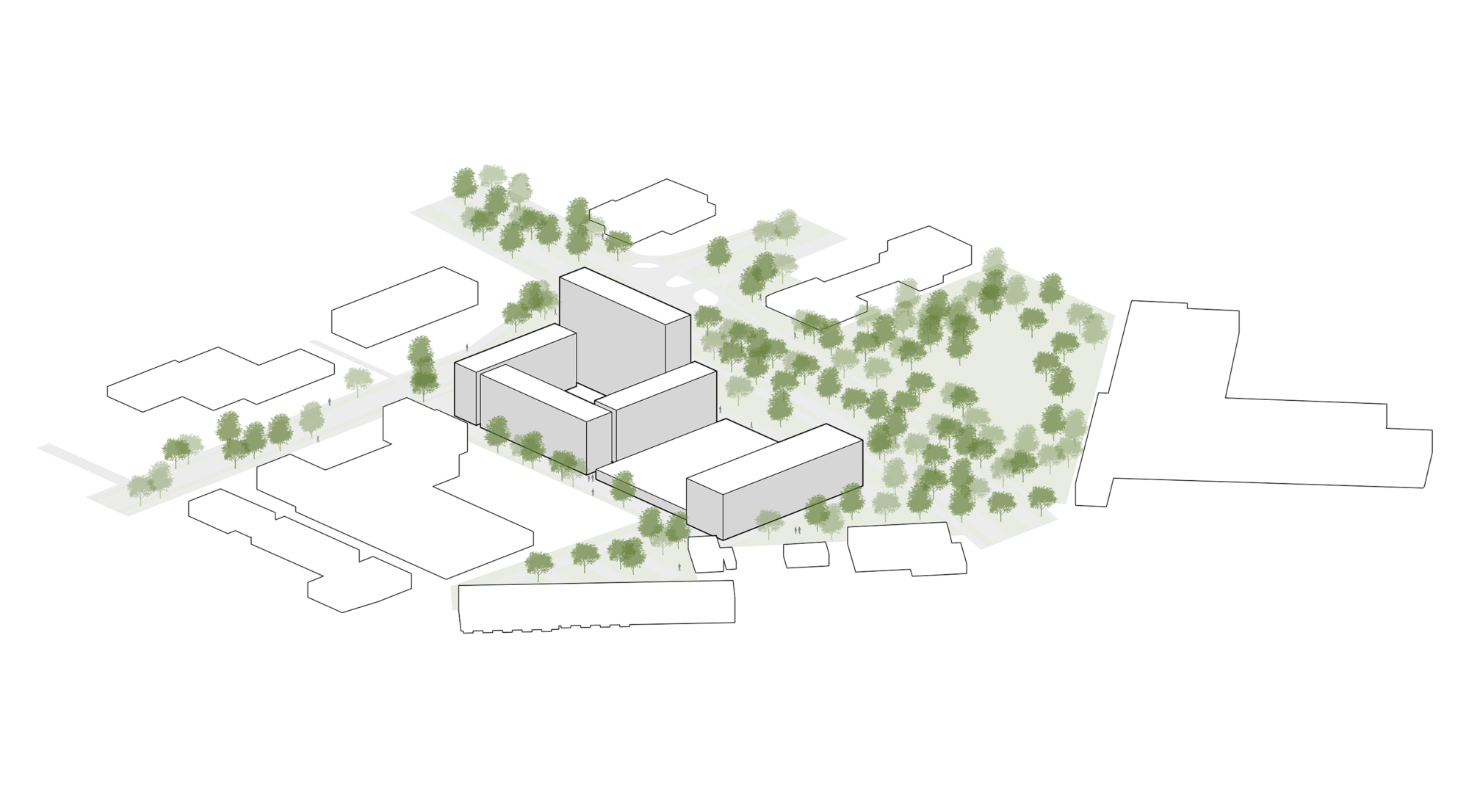 Het balkvolume van de 120 studentenwoningen staat op enige afstand van het carré. De tussenruimte wordt gevuld met een tweelaags gebouwde parkeervoorziening. Het dak van het parkeergebouw is voorzien van een groen dak en een voor de bewoners toegankelijk dakterras.