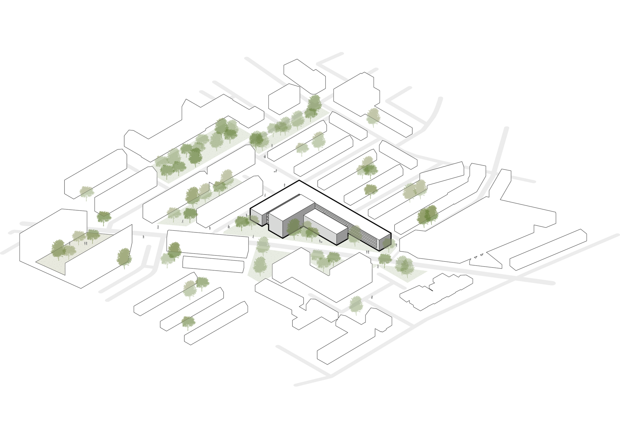 Uit het originele stedenbouwkundige patroon hebben we de richtingen van de bouwblokken overgenomen waardoor het nieuwe plan de oorspronkelijke structuur van het schoolgebouw volgt dat eerder op deze plek stond. Ook de architectuur van de bestaande wijk speelt een rol in het ontwerp. Dit komt terug in het kleurenpalet van de gevelsteen en het sobere metselwerk.