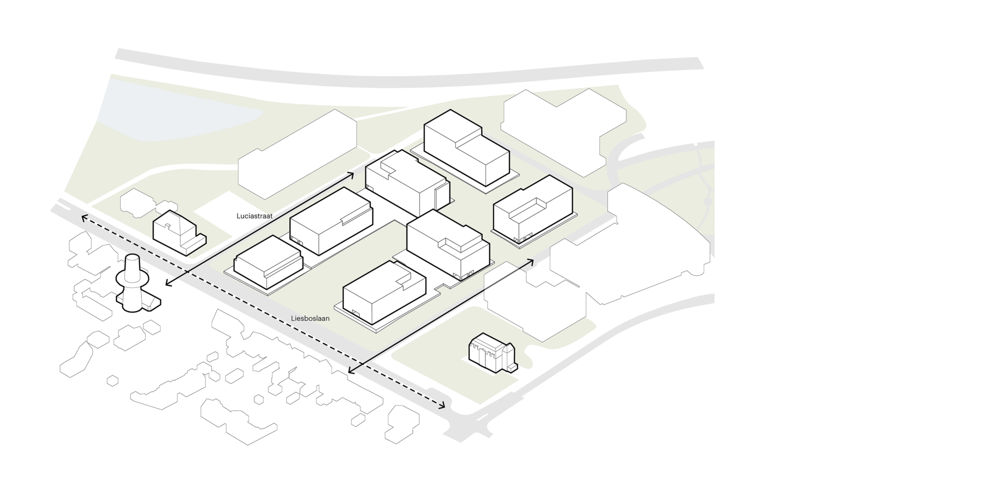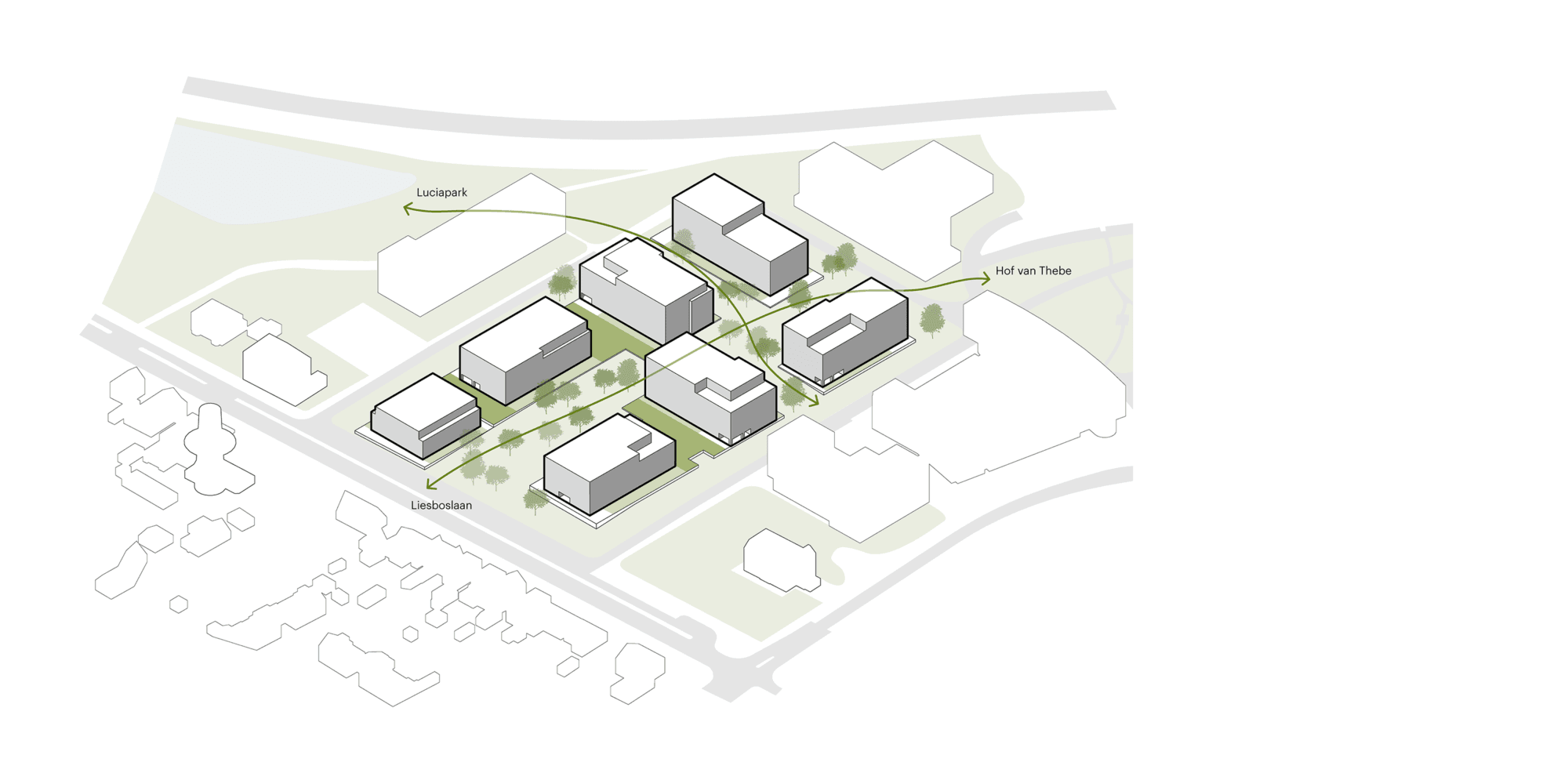 Door de sloop van een lage gemetselde stenen muur, die het voormalige Luciaterrein afschermde, ontstaat in deze laatste fase een mooie open verbinding tussen de Liesboslaan, de Heilaarstraat en het Luciapark. De bescheiden en uniforme architectuur zorgt ervoor dat de 7 bouwvolumes, die georiënteerd zijn op het nieuwe park en de bestaande lanen, maximaal afgestemd zijn op het groengebied.