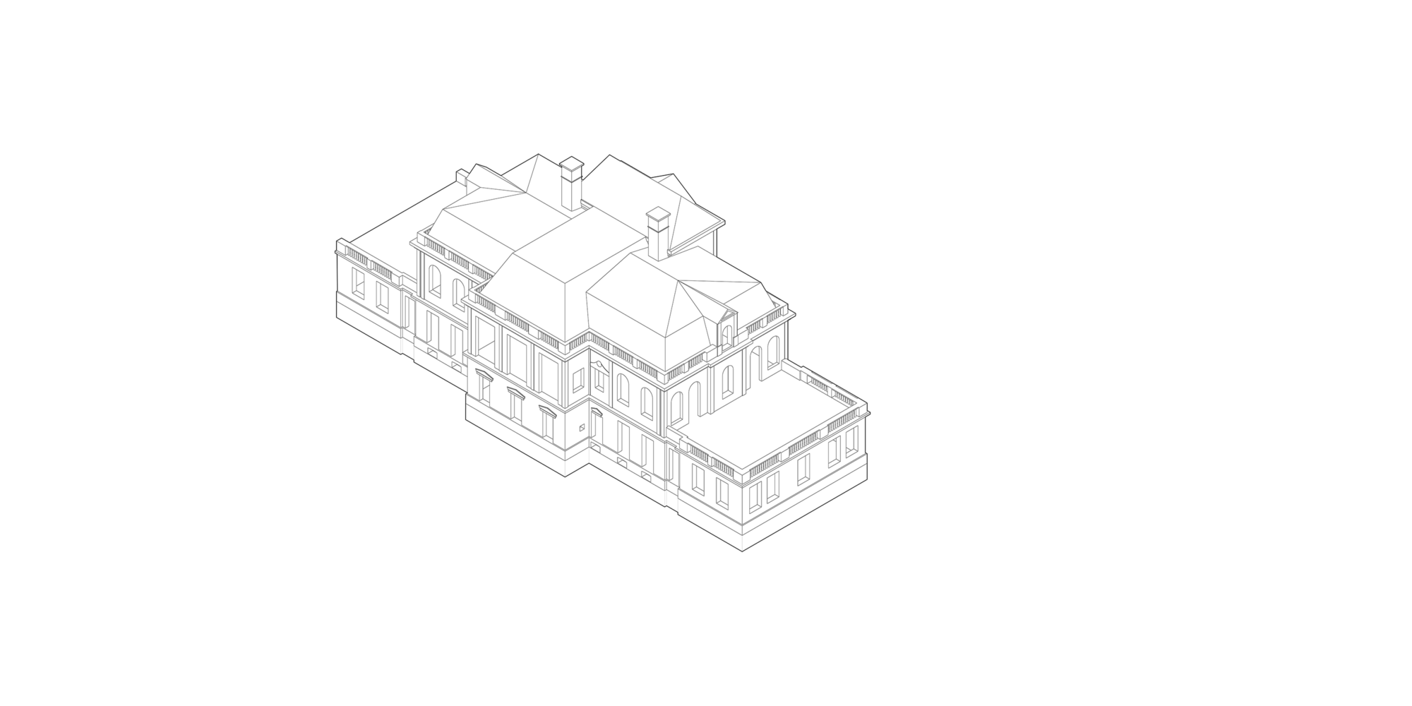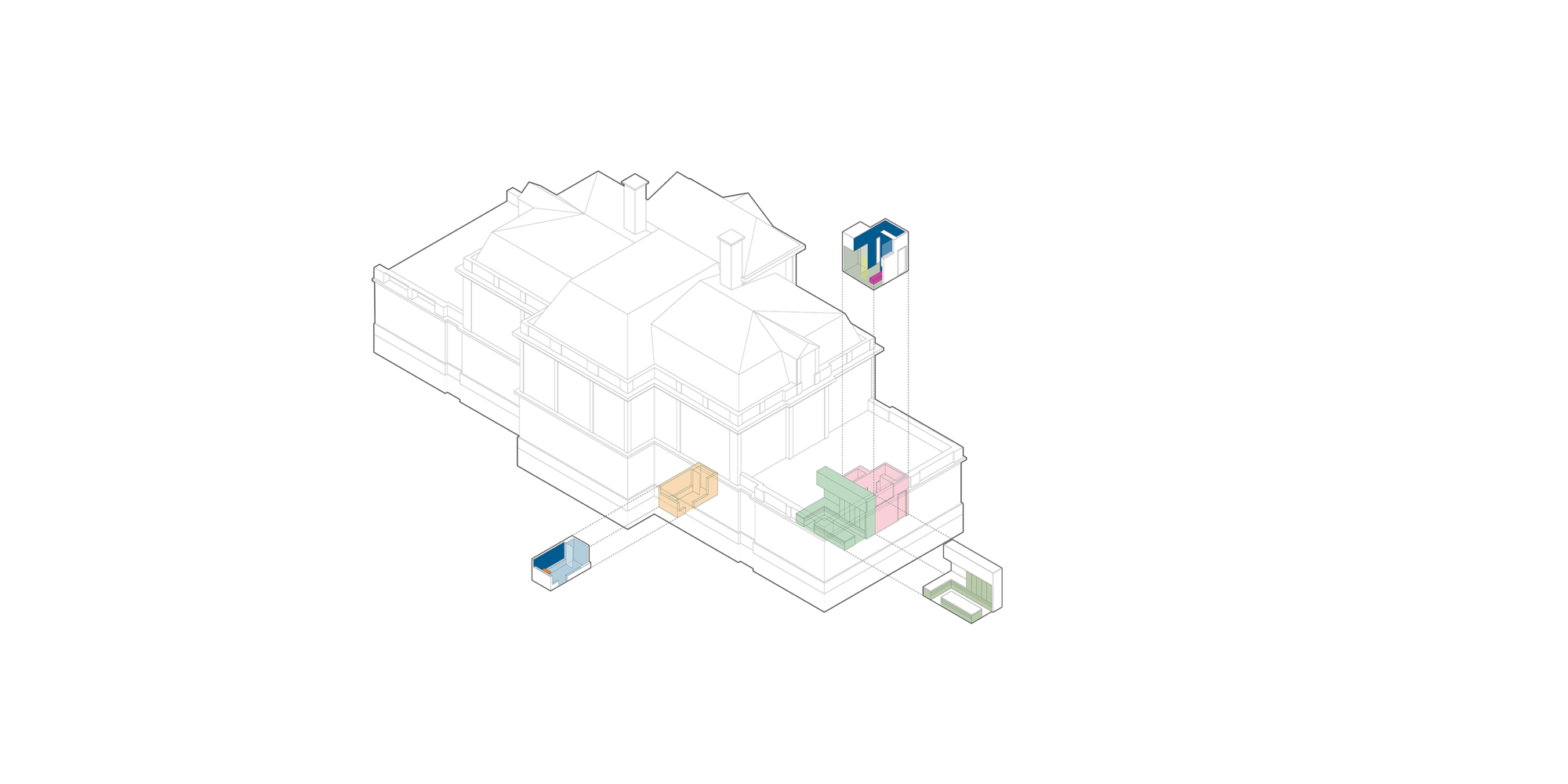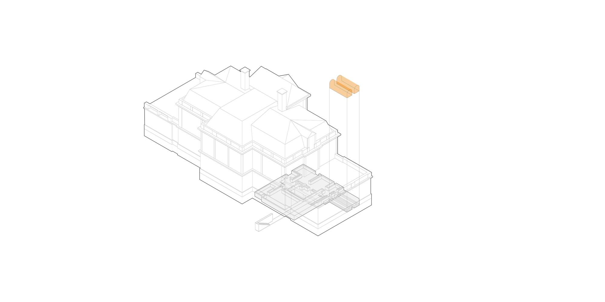 De overgangszone van de oudbouw uit 1889 en de uitbreiding van 1902 is hersteld en doet dienst als centrale verkeerszone waarin de twee woonverdiepingen verbonden zijn.